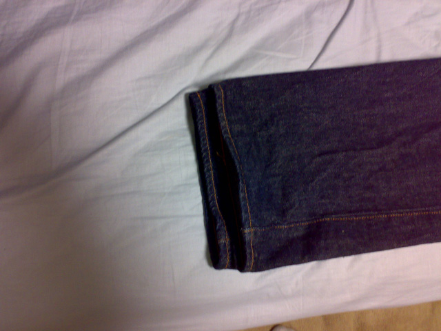 そしたらビックリ。 店員さん「あの、買うとき、色々と注意聞きました?」 オレ「え? うーん、まぁそれなりには・・・」 店員さん「左右の裾の長さが違ってるんですけど・・・」 オレ「(゚Д゚)!!」 買うときに注意を受けたのは、2,3回ほど洗ってから裾直しをしたほうがいいってこと。 2回目洗ったときでもまだ縮むんだってね。で3回目ぐらいでやっとなじむとか。 でも・・・左右で長さが変わったのはビックリしたっすよ。 ビンテージものの生地だから、縮みやすいというのは分かっていたんですが・・・ で、店員さんに話を聞くと、どうも生地の縫い目?の方向で縮む方向が決まるので、どうしても個体差でこういう状況が出てきてしまうとのこと(ビンテージものに限る?) なので、自分はクレームつける気なんて全然なく、逆に、ビンテージもののジーンズを穿きならす楽しさというか、愛着が余計に湧きましたよとw